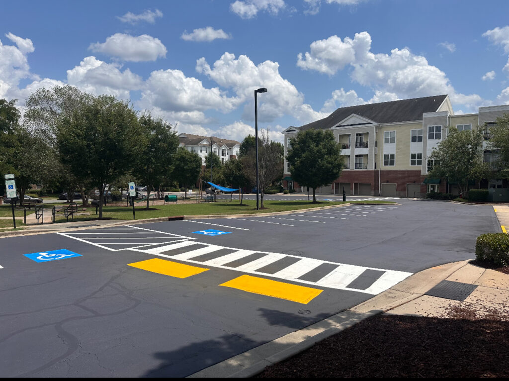 Our pavement marking process begins with surface preparation to ensure proper adhesion and durability. Existing lines are addressed as needed, and new layouts are measured carefully for alignment and consistency. We install parking stalls, fire lanes, directional arrows, crosswalks, loading zones, ADA-compliant markings, and other required designations.